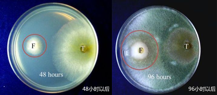 培养96小时:哈茨木霉菌的菌落要远远大于镰刀菌的菌落。